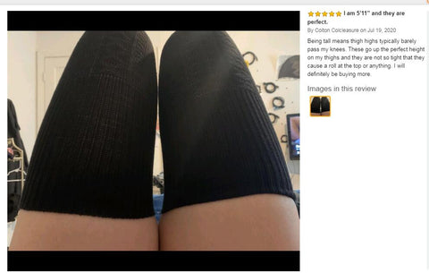 "Being tall means thigh highs typically barely pass my knees. These go up the perfect height on my thighs and they are not so tight that they cause a roll at the top or anything. I will definitely be buying more." This is a review from Amazon, July 18, 2020